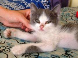 y aquí estoy buscandole alguien que quiera cuidarle y disfrutar de su alegre compañía...tiene 1 mes, es macho, gris y blanco, ha dado negativo en las pruebas de inmuno y leucemia felina, está desparasitado y ahora cojea un poco porque se ha debido pegar un golpe, pero me ha dicho la veterinaria que se le pasará, pero que como es tan peque no le puede dar antiinflamatorio..